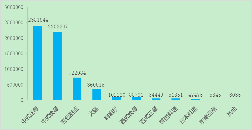 中式餐饮(中式正餐+中式快餐+火锅)门店占比82%,其中主要以中式正餐和中式快餐为主。西式餐厅数量整体占比不到20%,以面包、甜点居多。韩国料理、日本料理、东南亚菜等亚洲菜系的门店数不到2%。