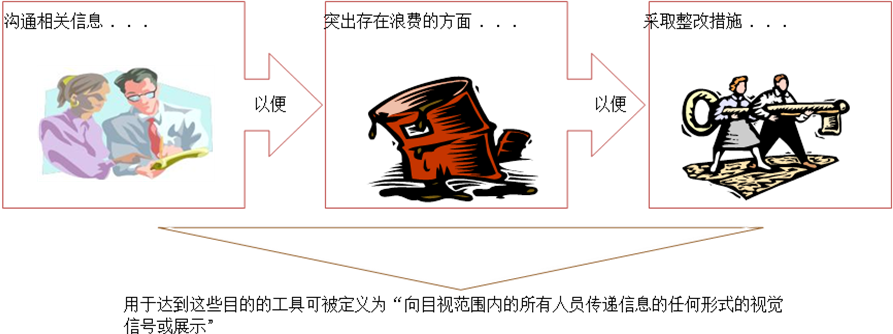 目视化管理是指得用各种形象的、直观的图表和色彩标识等视觉信息,提高生产率和管理效率的一种管理方法,是一个注重有效沟通的全公司系统,如图6-1所示。
