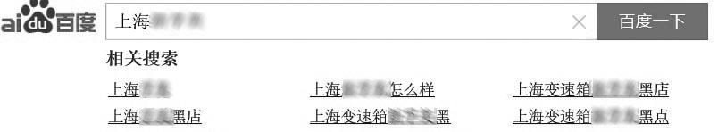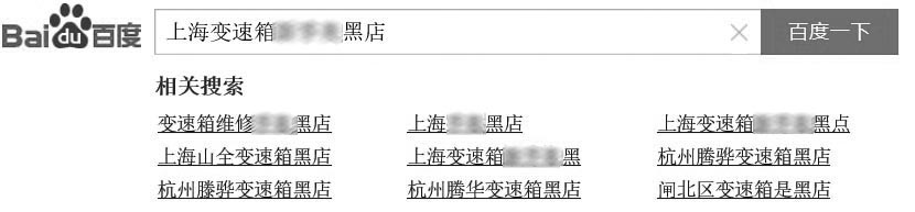 我试着用抹黑的相关搜索词“上海变速箱XFM黑店”再次搜索,底部的相关搜索里不但有XFM,还有其他同行,如山全、滕骅等。看来这个竞争对手不止针对一家恶意攻击,其他同行也遭受到同样的攻击,如图8-7所示。