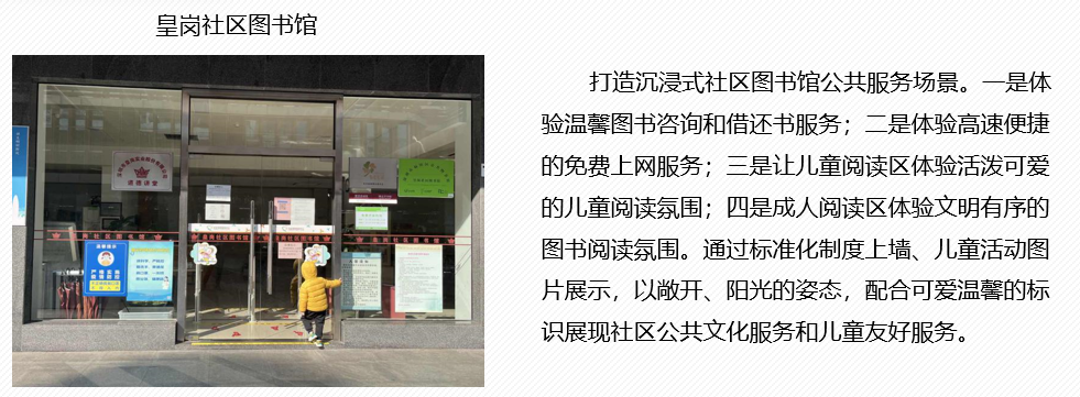 (2)通过在皇岗肉菜市场体验城中村综合治理服务、在社区图书馆体验公共阅读服务、在老人之家体验多元化养老服务、在皇岗老村体验建筑艺术与民俗风情、在锦绣园体验社区特色深港文化服务、在集中展示区陈列基本公共服务成果等形式营造基本公共服务氛围和标准化应用氛围,实地展示基本公共服务的标准化提供过程和实施保障的具体措施、硬件设施等。