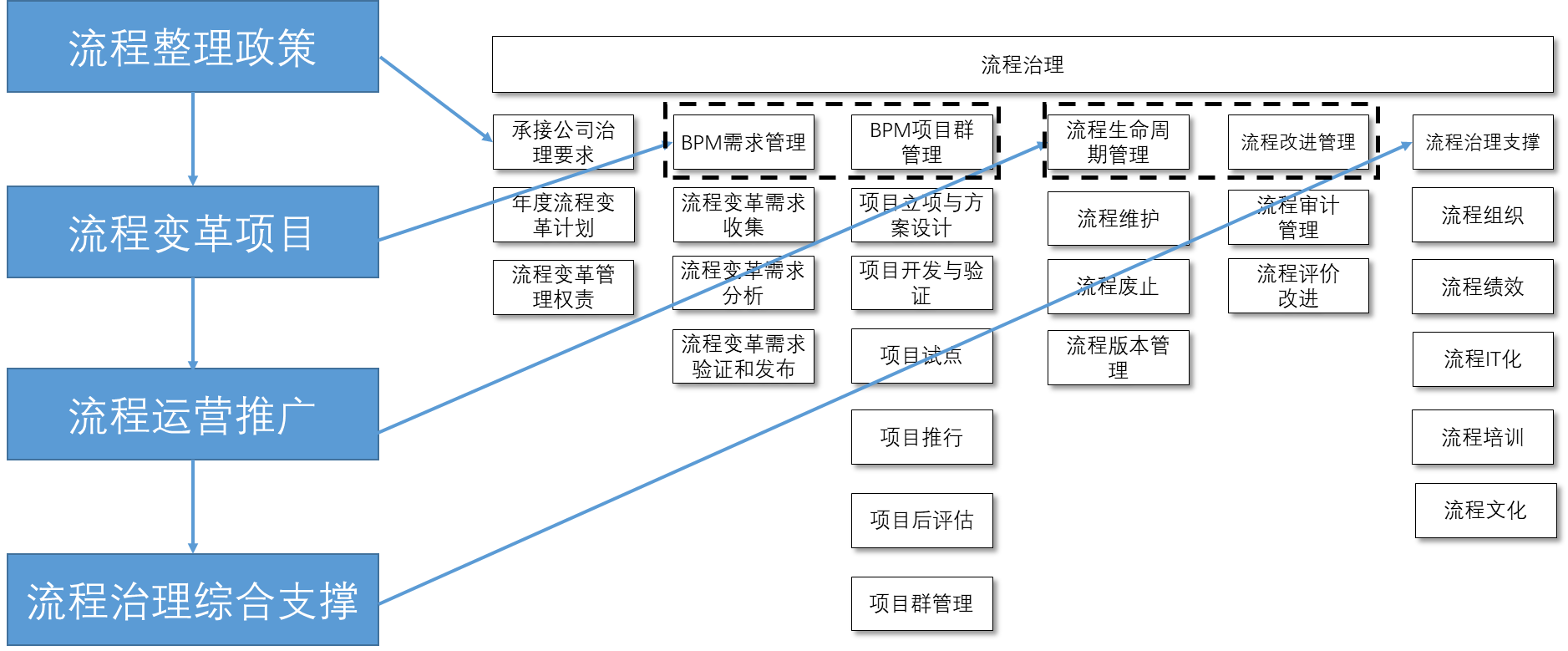 该架构主要分为四个模块,四个模块分别是流程治理政策、流程变革项目、流程运营推广、流程治理综合支撑,这是同流程治理业务模型相对应的。