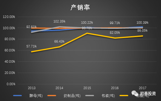 在产量逐步稳健增长的情况下,最重要的是生产出来的产品能否卖得出去——即销量表现如何。通过对比近五年产销率可知,2014-2017年酵母、奶制品及包装产销率维持在100%附近,销量随产量一路上涨,基本处于满产满销状态;制糖随着产量提高,产销率逐年提升,逐步打开市场使得销量增加。如图2-35所示。