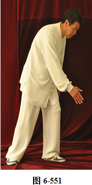 左云手:接上式,腰微拱向左旋转,左脚以脚跟为轴向外转脚尖,右脚以右脚跟为轴向里转脚尖;腰随即后拱,成后倚坐式。左手随腰转下划摆至左胯侧旁,右手随拱腰下摆落于右腿侧旁;腰上提走弧形,右手经腹前向左下穿掌,掌心向左。上身微俯,随穿掌重心移于前腿(见图6-549至6-552)。腰上提身体直立,右脚随身体直立向左脚并拢。右掌抽回胸前,高与乳平,掌心向里。左手弧形回拉至腹前,掌心向里。右手在上,左手在下,两臂圆撑,脊背后倚。
