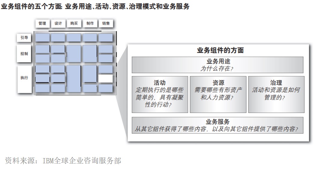 组件化业务模型(CBM)的核心是业务组件(又简称为组件),组件是组件化业务模型(CBM)的功能模块,每个组件包含业务用途、活动、资源、治理模式和业务服务五个维度,如下图所示: