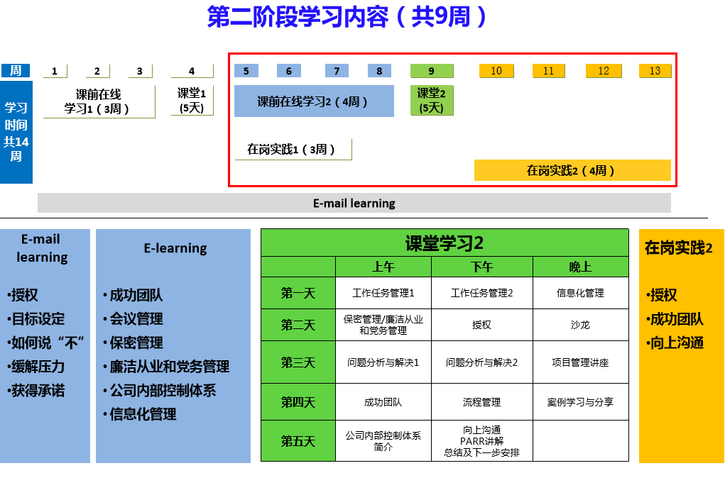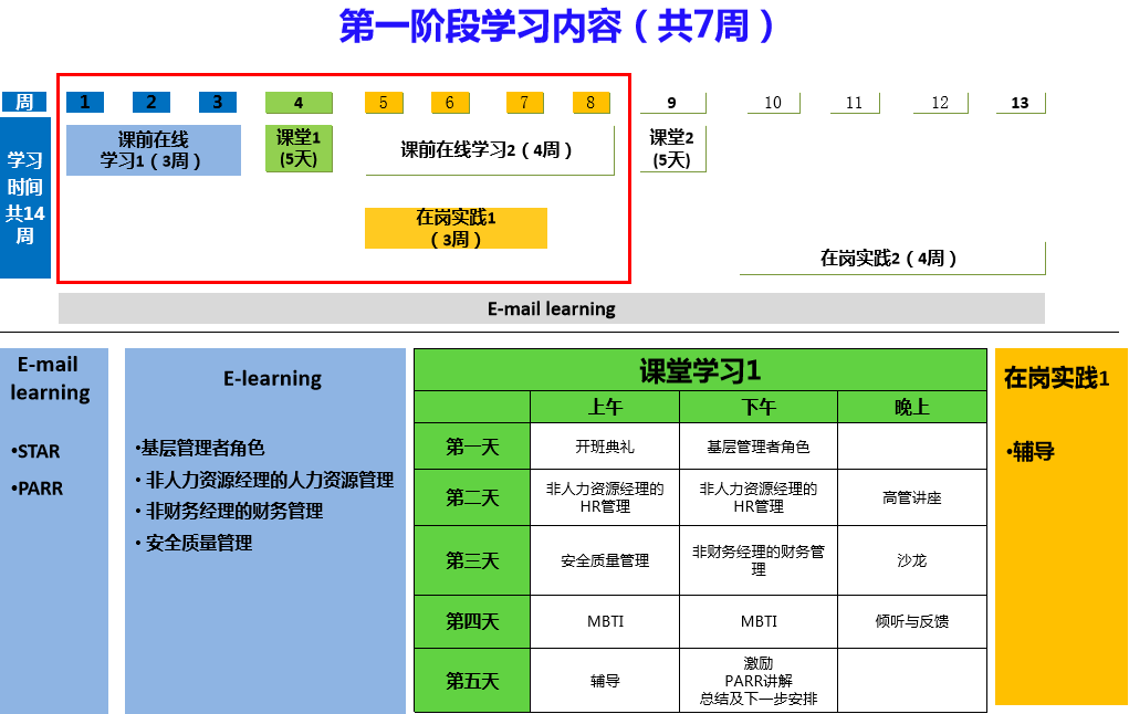 学员职责 | 按进度要求完成在线学习活动 | 积极主动全程按时参加课堂学习班 | 按时完成PARR在岗实践,并与上级主管回顾分享在岗实践体会与提升机会 | |