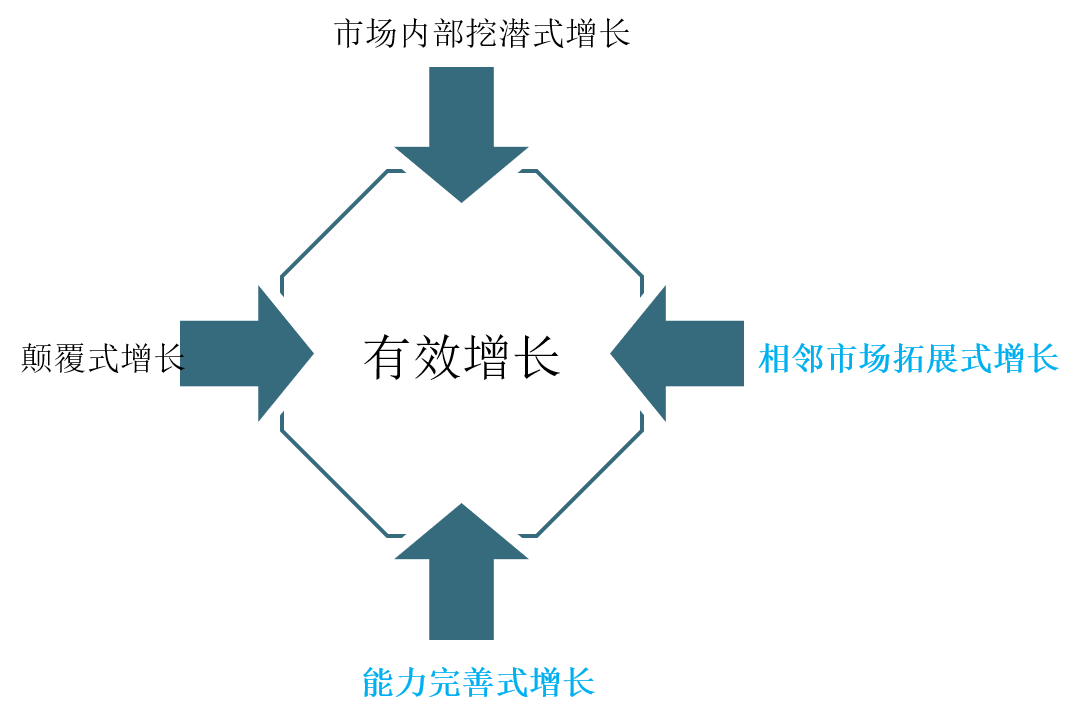 首先是“市场内部挖潜式增长”,其原理是在现有核心市场和现有客户群体中发现新的增长机遇。这些机遇包括尚未被他人开发的市场。典型的案例是亚马逊,亚马逊实施Prime会员制,客户购买之后可以免费送货,这极大地利用了亚马逊强大的供应链能力,同时带来了新的收入。在国内,京东模仿这一策略推出Plus会员制,也取得了很好的结果。