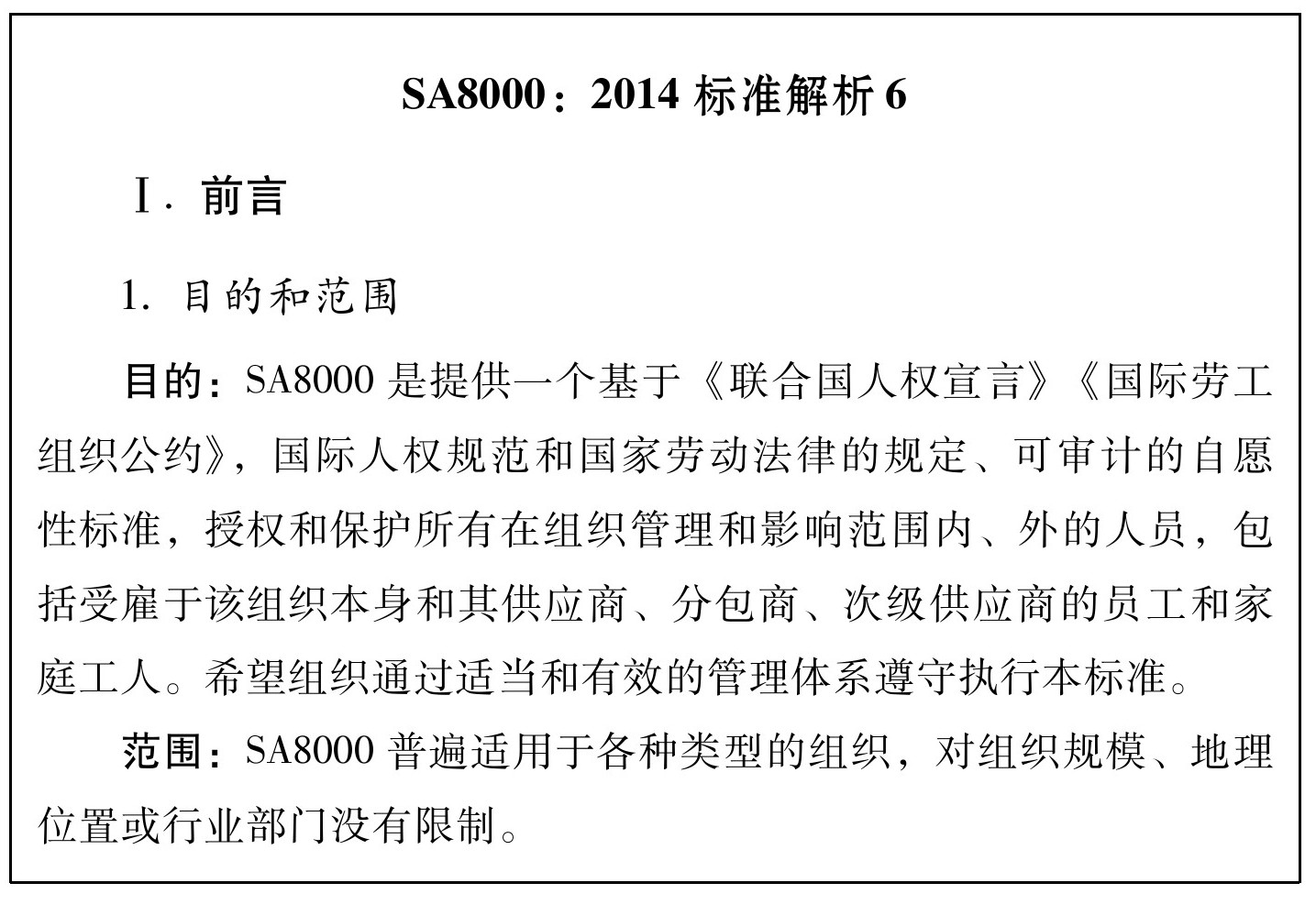 4.本标准目的在于提供一个基于联合国人权宣言,国际劳工组织(ILO)和其他国际人权惯例,劳动定额标准以及国家法律的标准,授权并保护所有在公司控制和影响范围内的生产或服务人员,包括公司自己及其供应商、分包商、分包方雇用的员工和家庭工人。