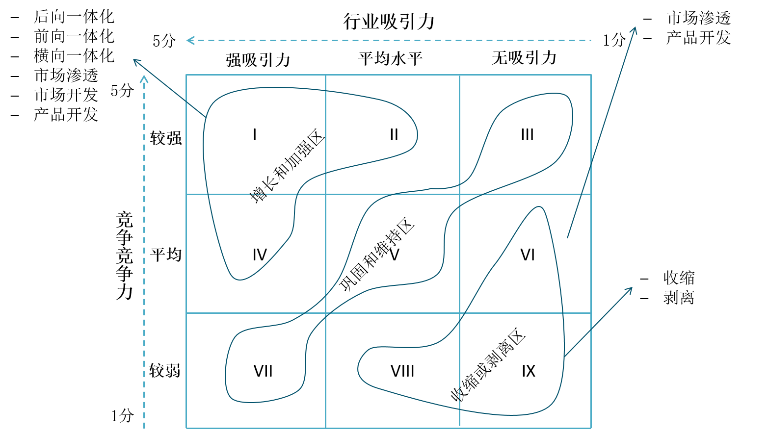 产业的静态分析可以帮助企业分析一个产业的吸引力,解决“可做”(例如是否投资一个项目或者进入新的业务)的问题(而“能做”则取决于企业的资源和能力)。在多个业务组合工具中(例如GE矩阵,这是一种常用的业务组合分析工具),都需要分析产业的吸引力。GE矩阵由行业吸引力和企业竞争力两个维度组成,根据不同的组合可以得到增长和加强、巩固和维持及收缩和剥离三种战略,如图8-5所示。
