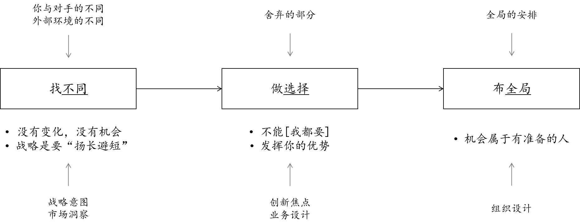 到底什么是战略规划?正如“一千个人眼里有一千个哈姆雷特”,每本书都有自己的定义。但是,现有战略管理教材对于战略规划的定义太繁杂了,笔者习惯采取下述定义(如图1-1所示,与该定义所对应的市场洞察、创新焦点、业务设计等在以下章节分别进行阐述):