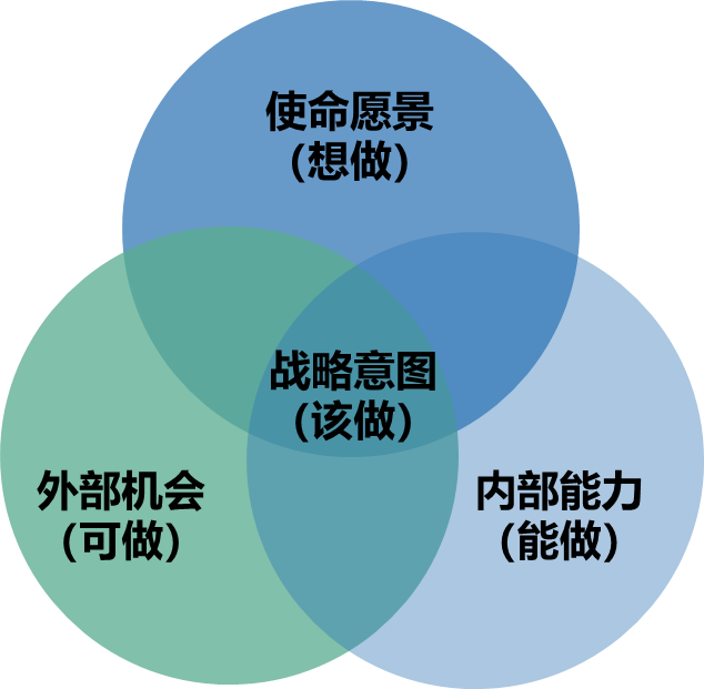 我们通常说“有多大能力做多大的事”,战略意图不是企业一厢情愿决定的,也不是越大越好,通常是综合考虑使命愿景、外部机会及内部能力三方面因素做出的选择。如图5-3所示。