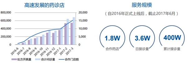 从2017年3月份立项开始,到2018年6月份,微医药诊店已经与1.8万家药店达成合作,相当于每天都有30~40家药店接入药诊店系统。从问诊量上看,微医药诊店日均接诊量达到3.6万次,累计接诊量超过400万次,几乎等于协和医院一年的接诊量。