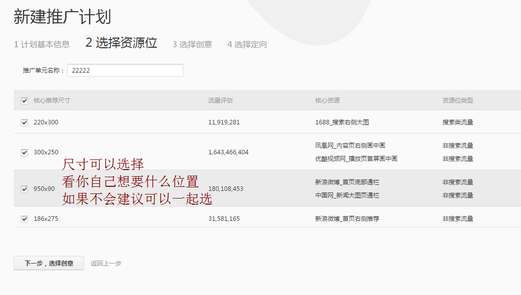 第三步,选择创意。主要是选择创意图的尺寸大小,图片的大小要自己去设计,阿里巴巴会根据你选择的位置来自动设置生成。可以选择的尺寸为:220×300像素、300×250像素、950×90像素、186×275像素、600×150像素、336×280像素、270×368像素。知道了这些,接下来就要添加创意了。
