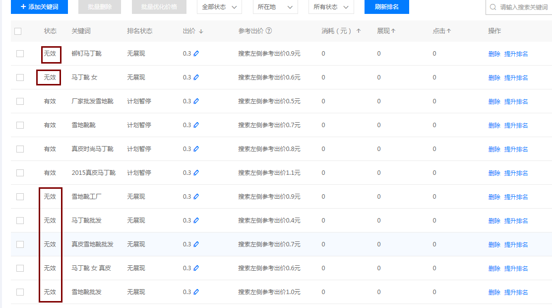 编辑好了,并不代表你通过,能有一个好的排名,或者说排到前面去,因为这个排名类似于百度竞价,随时有人会调整。我们来看一张之前做过的计划表,当我们看到状态是无效时,就证明这个词需要调整了。