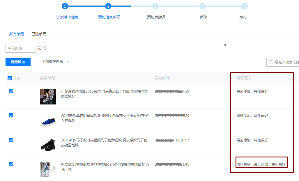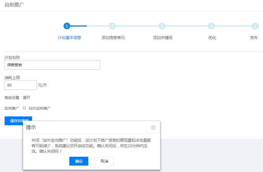 自助推广分为五步:计划基本信息、添加信息单元、添加关键词、优化、发布。
