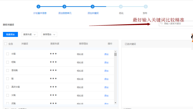 系统会自动匹配关键词,但是也不精准,所以建议在右边输入精准关键词,这样匹配度比较高,效果也比较好。我们看到输入关键词之后系统匹配的关键词,就可以进行合适的选择,选完之后保存并继续。备注:选择三颗星的热度高的词。
