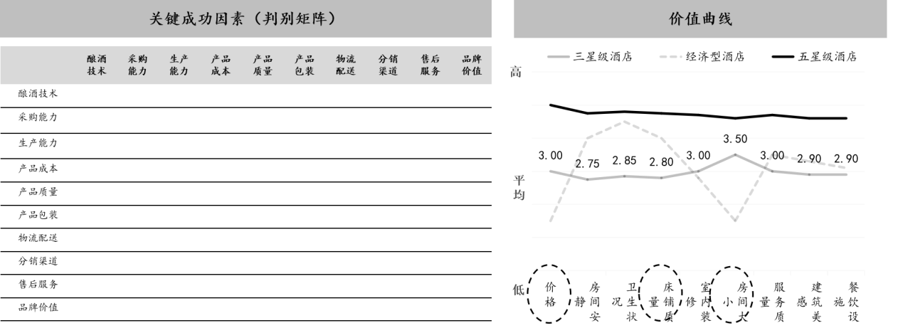 价值要素通常使用“关键成功因素”和“价值曲线”工具来判别和确认价值主张。价值要素是客户看重的价值,是在竞争中取胜的关键环节,可以通过判别矩阵的方法来定性识别(如图2-45所示)。
