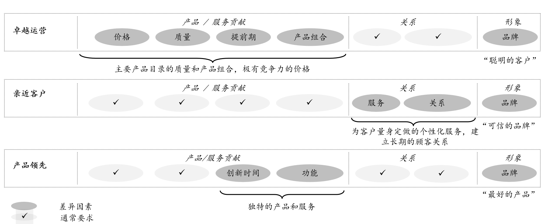 价值主张(Value Proposition)是关于组织如何向客户区分自己,以及它将提供如何特别的一套价值的描述。价值主张概念来自特里西和迈克尔合著的《市场领导者的法则》,它将价值主张界定为“运营卓越”“产品领先”“亲近顾客”三个维度(如图2-43所示),分别代指一流的运营和执行(特别注意:卓越运营的含义比“低成本”更广)、强调创新和市场品牌、企业卓越于顾客关注和顾客服务。“价值主张”是BLM框架中的核心概念,影响了后续人才以及组织架构、组织流程、组织激励等诸多因素(价值主张这一概念后来被卡普兰用于战略地图中的客户维度)。