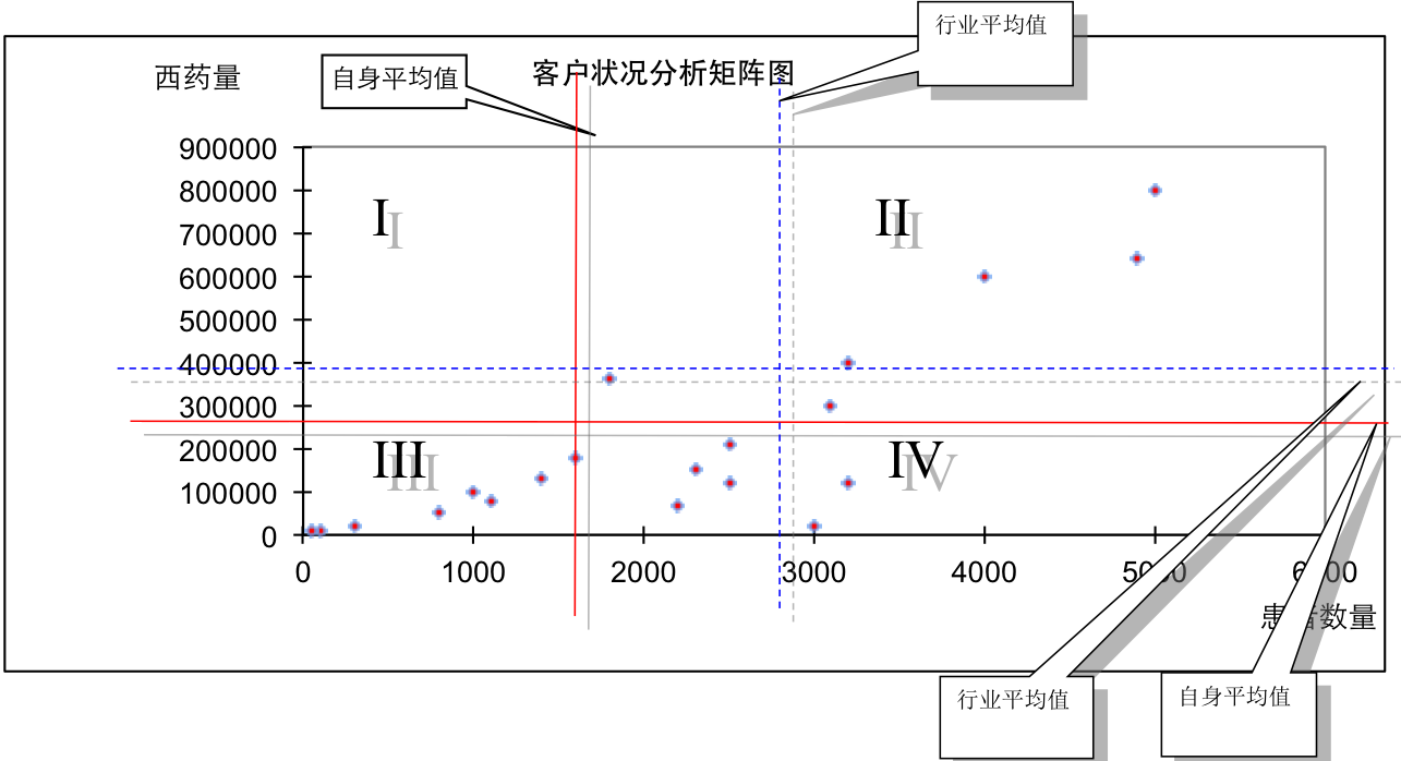 经过标准值的设定,就可以看到在I象限里的客户西药量是超过标准值的,而患者数是低于标准值的;II象限里的客户西药量和患者数都是高于标准值的;III象限里的客户西药量和患者数都低于标准值;IV象限里的客户西药量低于标准值,患者数高于标准值。