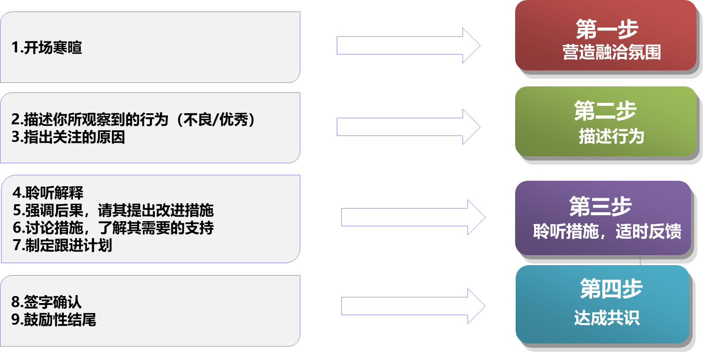 聆听措施,适时反馈:聆听解释;强调后果,请其提出改进措施;讨论措施,了解其需要的支持;制订跟进计划。