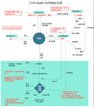 PBM业务是通过CVS Health自身的强大集团优势,将自身信息系统、医疗人员及药店资源进行整合,并通过较高的议价能力沟通药品流通行业上下游,在保证签约方的利益相关者获得较高医疗保障的同时,降低医疗费用支出。CVA Health的PBM业务主要提供:a.制定药品福利计划;b.处理药品类赔付申请;c.审查处方药合理性;d.制定鼓励使用低成本的处方药;e.药品邮购服务。而所有PBM的功能中,最核心的是处方审核。