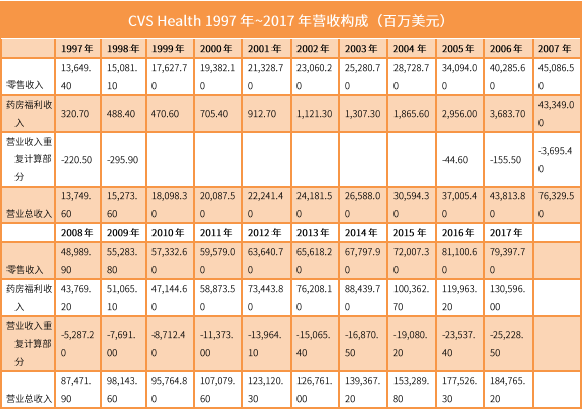 CVS Health从1994年开始重新设定战略性的发展规划,这个转型战略是打造一个以线下零售网络为基础,以药店福利管理(PBM)为动力的“双核心”发展策略。对于CVS Health而言,线下门店的布局是整个集团业务的基础,而PBM业务则是推动集团业务快速发展的原动力。通过大力投入PBM业务,整个CVS Health的业务线由传统的药品零售带动的业务增长转型为由“药店福利管理+药品零售”双驱动带动集团业务增长。