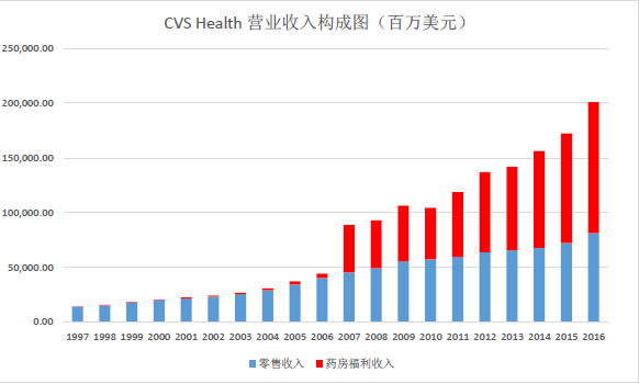自1994年开展药店福利管理业务以来,CVS Health首先尝试通过自身零售药店网络建立药店福利管理业务。通过10年时间的摸索,CVS Health的PBM业务逐年增长,在2006年达到36.83亿美元。2007年,CVS Corporation(原名)与Caremark Rx合并成立CVS Caremark(现在重新命名为CVS Health)。CVS Health借助Caremark Rx已经建立的PBM业务,整合线下零售网络优势,使得CVS Health的业务收入真正实现从单轮的药品零售收入向药品零售+PBM双轮驱动模式转变,如表2-7所示。