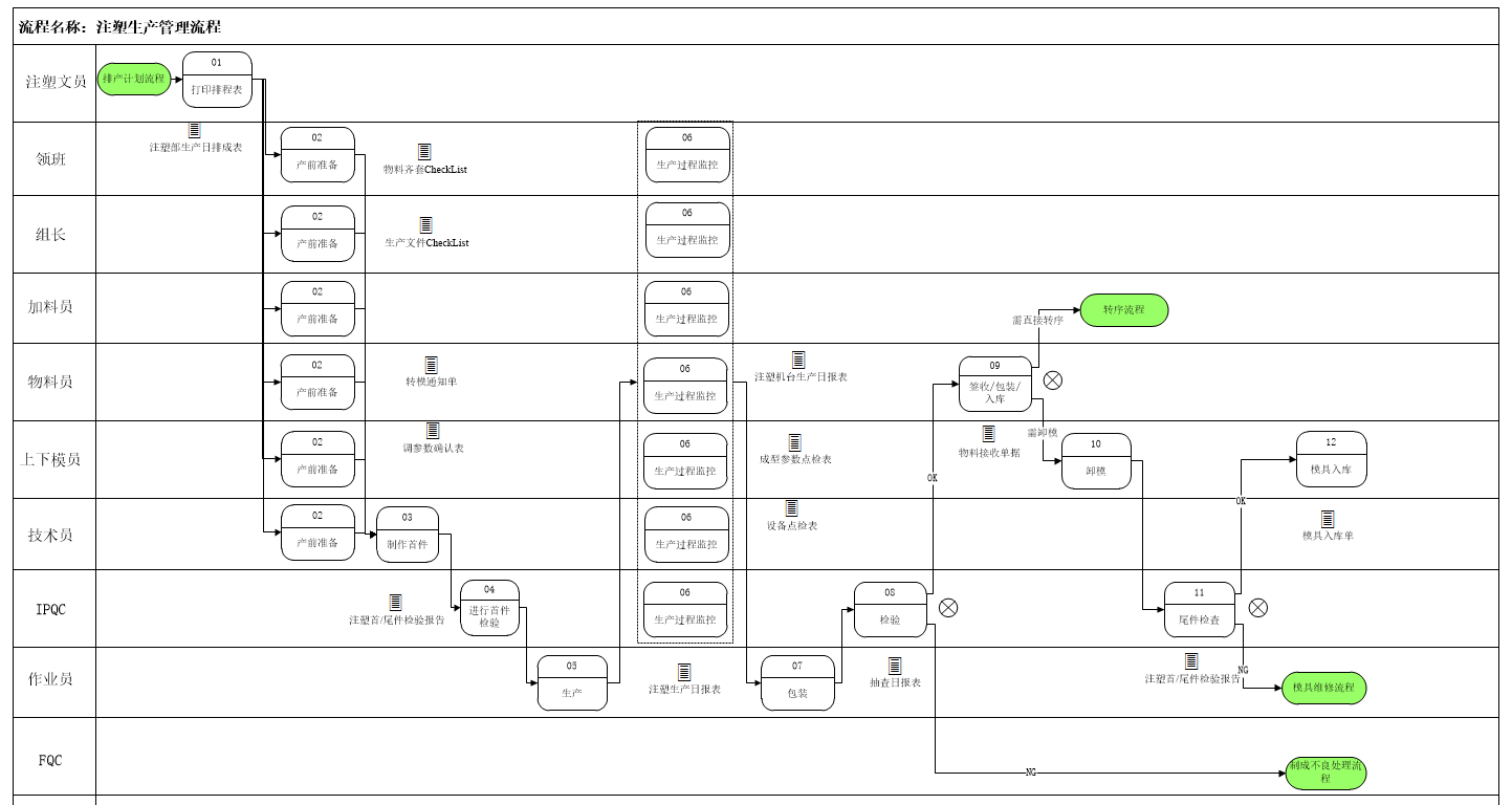 图中有些活动旁边放置的文本符号代表模板或操作指导书,代表执行该活动时,按照既定的模板或操作指导书执行。比如活动“04-进行首件检验”,需要按照“注塑首/尾件简报报告”模板执行。这些模板或操作指导文件会以该流程附件的方式存在。