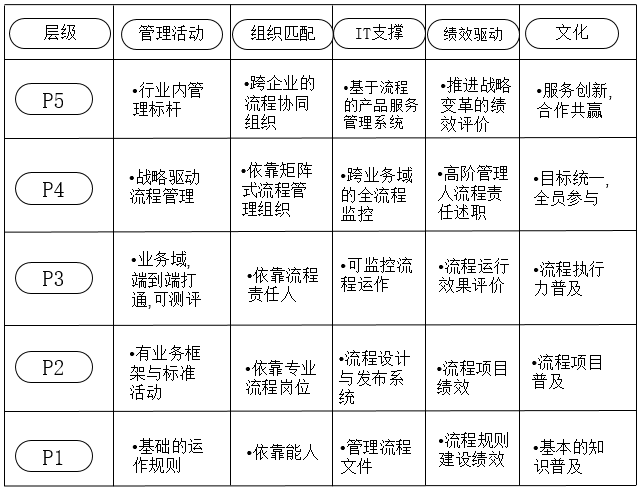 根据流程成熟度等级模型评估后,再依据具体内容分解出管理活动、组织、IT、绩效、文化五个维度的具体目标。