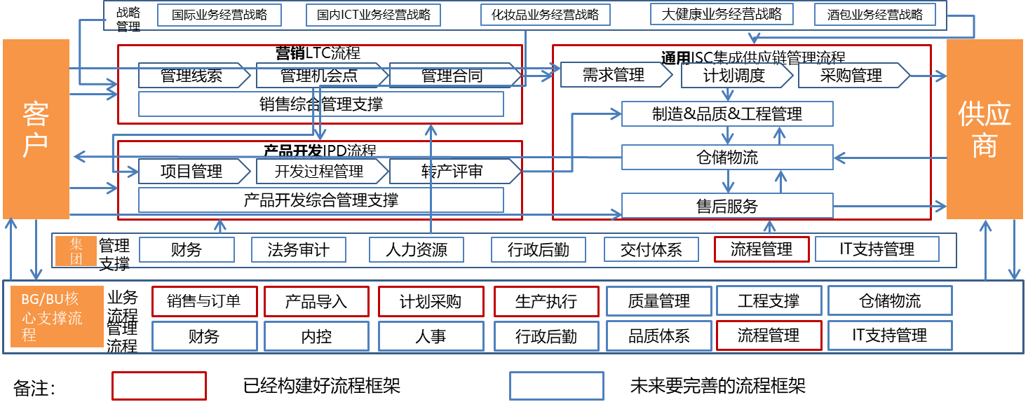 方向一:要将业务流程植根于业务系统中,比如营销LTC(线索到回款)流程植根于CRM(客户关系管理)系统中,研发IPD(集成产品开发)植根于PLM(产品生命周期管理)系统中,ISC(集成供应链)植根于ERP(企业资源计划)系统中。业务流程与IT系统的匹配,才能真正让流程治理发挥出更高的价值;