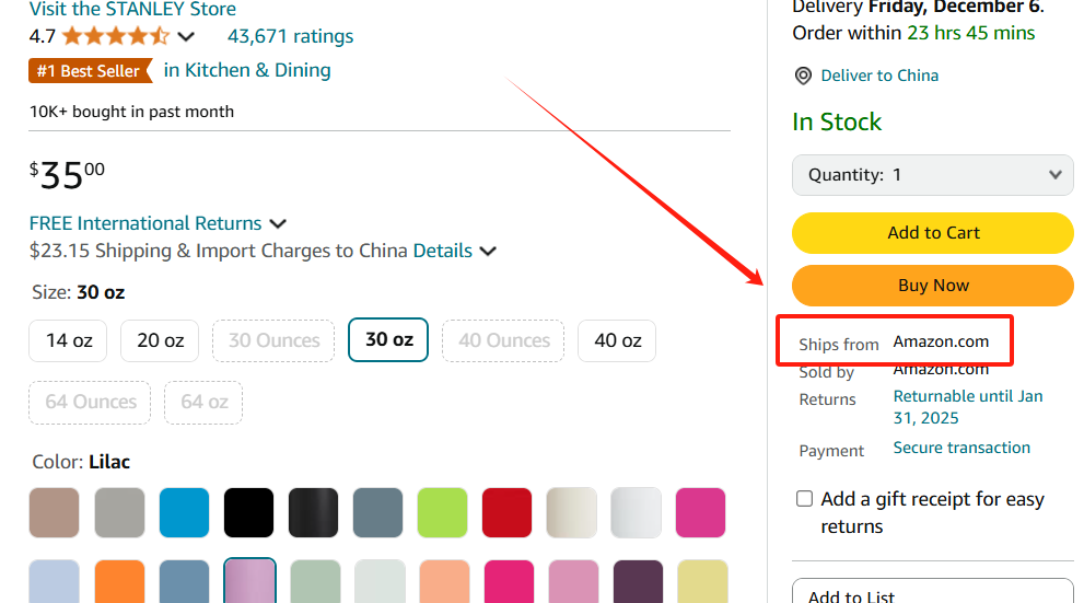亚马逊提供两种主要的物流方式:FBA和自发货。FBA是亚马逊的物流服务,卖家将商品发送到亚马逊的仓库,由亚马逊负责存储、拣货、包装、配送和客户服务。自发货则意味着卖家自己处理这些环节,对于出海企业而言一般选择FBA模式。采用FBA发货模式的卖家,在商品购物车的下方都会显示“Ships from Amazon”(由亚马逊配送)的字样,如下图所示。