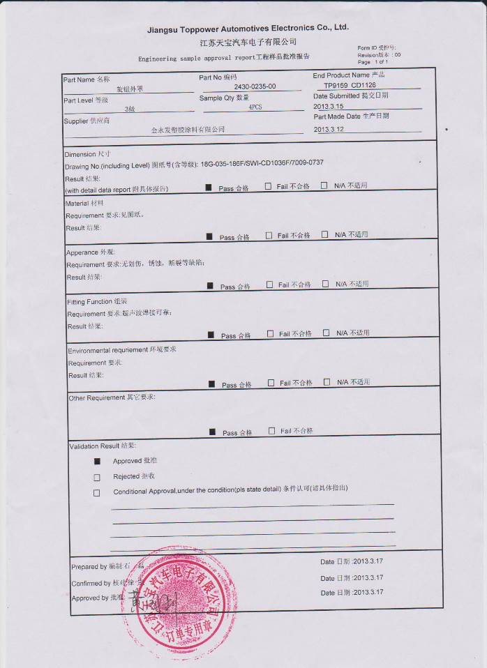这里包括材料性能测试结果和成品性能测试结果,主要分为两种情况:一种是有些项目材料测试了,成品可不测,如ROHS检测。另一种是有些项目只能在成品或半成品测试,这个要看客户认可的试验大纲,试验大纲可不提交,但大纲的检测项目必须提供完整的证据。以下是一个实验大纲的案例,仅供大家参考。