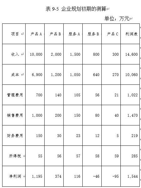 表9-5是企业规划初期进行的测算,对于服务B和产品C,企业在规划阶段就需要将它们淘汰掉,这样可以保证企业在以后的运营中剔除财务风险。因为这两个业务链条,从开始就会消耗企业其他产品和服务的净利率,我们叫它“吸血”链条。在设计盈利模式时,需要测算出吸血链条,并从根就解决。