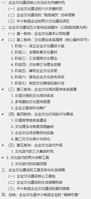 - 把握企业文化的四大层次:精神层(核心,含六大要素)、制度层(流程、规章)、行为层(员工行为规范)、物质层(文化墙、企业标识),各层次需围绕精神层协同发力,避免割裂。例如陈凯洁具在文化建设中,先确定精神层理念,再优化生产流程、员工行为规范,确保各层次与核心理念一致。