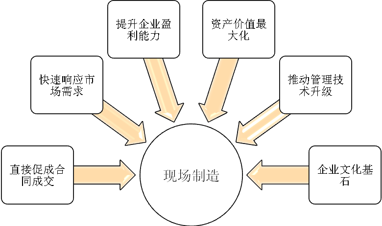 从管理会计角度而言,现场制造应用了诸如企业的厂房、设备、材料、人力、资金等绝大部分资源,这些资源的应用效率和回报效益在很大程度上受现场制造管理方法和水平的影响。即通过科学管理,必须发挥现场制造如同图4.1的六大作用。