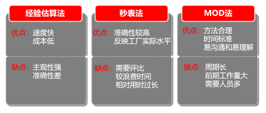 目前制造行业较常用的三种算法使经验估值法、秒表法和MOD法。优缺点如图1-3所示。