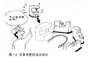 为了实现“一个流”生产,必须将设备的布置进行调整,不是按类型,而是根据加工工件的工序顺序进行布置(称为垂直布置),形成相互衔接的生产线(图7-2、图7-3、图7-4)。