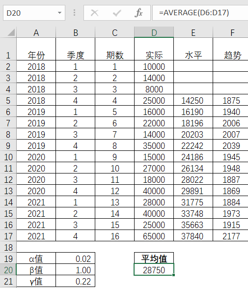 完成规划求解之后,得出新的三个参数,α值为0.02,β值为1.00和γ值为0.23。确立这三个参数之后,MSE值达到最小化,为33865391。那么可以根据这三个参数进行后续期数的预测。除此之外,最小化MAE, MAPE等其他数值,以此求得适合的参数,可以根据实际情况和需要进行选择,以及比较。