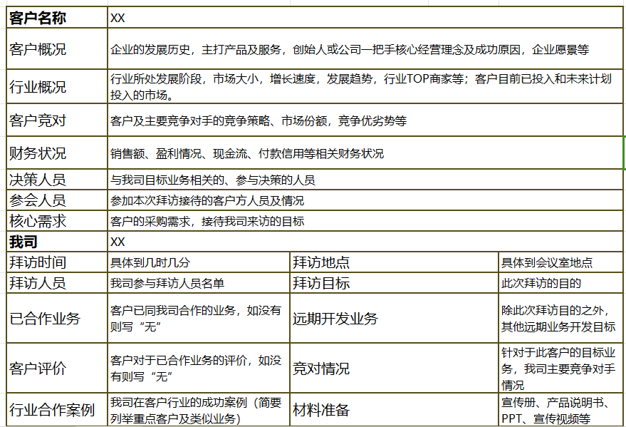 另外,提前做好《客户拜访准备表》,不仅是为了让我们全方位了解客户,还能让领导更懂客户,因为拜访客户时领导经常会同去。