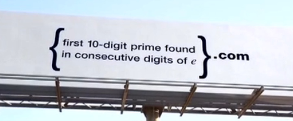 广告上是一道数学题:{e的连续数字中最先出现的10位质数}.com,这题答对了后还会有一道类似的题目,连续答对了两道题,就会收到谷歌实验室的一封信:“我们要找的人才就是你,快加入我们团队吧!”