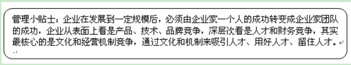 现阶段,个人打天下的时代已经结束,企业要培养很多具有经营能力的小企业家,依靠企业家整个团队来共同打天下,企业才有可能做大、做强、做久。企业团队的打造首先需要文化,要形成吸引和塑造企业家团队的文化氛围,要建成价值观统一、能力互补的队伍;其次,在拥有良好团队的基础上,再有一套好的机制来配套,好的机制可以吸引优秀人才的加盟,激发人才的潜能释放,从而真正实现员工从“要我干”变成“我要干”。