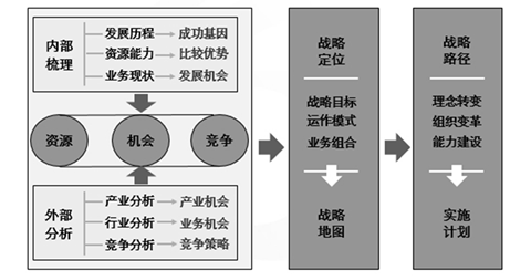 针对工业营销战略,恩虹咨询研发了营销战略梳理逻辑和营销战略“三维度”检核等工具。工业营销战略梳理逻辑包含四个步骤:内部梳理、外部分析、战略定位和战略路径,如下图所示。