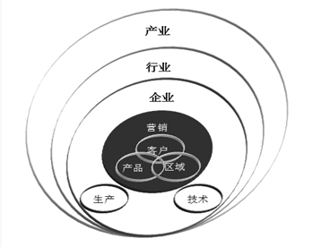 工业营销战略的“三维度”检核,即产业—行业—企业(第一个维度);营销—生产—技术(第二个维度);产品—客户—区域(第三个维度),如下图所示。