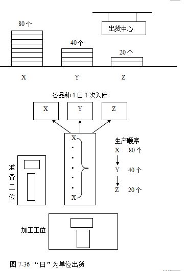 假如有X、Y、Z三种产品,某月的生产要求分别为X:1000个、Y:600个、Z:400个,那么按照传统的生产安排方式,生产计划会按表7-6及图7-29所示进行安排。即先将品种X生产完毕,再生产品种Y,最后生产品种Z。以月为单位进行排程。这种生产安排也称之为分段生产。在品种较少的情况下,此种生产计划或许可行。但在当今市场需求多样化的时代,仍然长期坚持此种生产安排将使企业经营陷入困境。这种传统的大批量生产的方法,可以节省作业切换时间。但是,会与市场需求出现很大的差异。因为一个企业的产品一般都有多个用户,每个用户对产品的品种、规格、型号、式样以至颜色的要求不同,要求交货的具体时间也不相同。按照需求的这种特征,企业应该在尽可能短的时间内(比如一天)提供尽可能多的品种。大批量的方法势必造成一部分产品一时供大于求,销售不出去,造成积压。同时,另一部分产品一时生产不出来,供不应求,发生缺货。这两种情况都造成损失和浪费,使企业丧失销售时机,失去市场。另外,从企业内部组织生产来看,批量大固然给组织生产带来一定方便,但会造成资源浪费。由于面临多品种生产,企业必然配备多种设备与多种技能的工人,准备多种原材料。如果一段时间只生产一种产品,会造成忙闲不均。在生产某一种产品时,可能一部分车间和设备超负荷运行,部分工人加班加点,某些原材料和外购件一时供应不上。相反,另一部分车间和设备负荷不足,甚至空闲,工人无事可干,某些原材料和外购件出现积压,造成浪费。过了一段时间,生产另一种产品时,闲的可能变忙,忙的可能变闲。同样会造成浪费。从表7-6中可以看出,X品种的产品通常会导致较长时间的库存(不仅仅指工厂的成品仓库),Z品种的产品大半个月无货可供应市场。