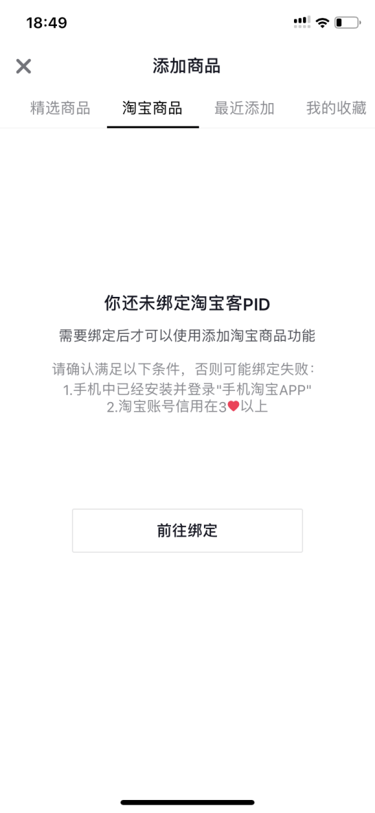 点击电商工具箱的“商品橱窗管理”,就可以看到绑定淘宝商品的端口,如图2-4所示。绑定淘宝链接有两个条件:一是手机中要安装并登陆“手机淘宝APP”;二是淘宝账号的信用需在3颗心以上。