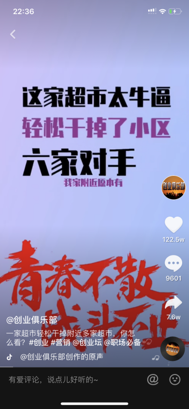笔者有一个抖音视频,分享的是笔者家楼下小区超市的营销案例,点赞量只有6485人,而一个南京的公司人员转发了这个视频,点赞量竟然突破141万。这个账号原先粉丝只有不到一万人,结果一晚上粉丝增加了25.9万。这就是原创不火的经典案例(图2-17),对方只是把背景换了一下,声音和内容全是笔者的,竟然“也算原创”了。所以,对于抖音的原创,大家要有更直观的认识。别怕模仿和复制,关键是要有创新元素。