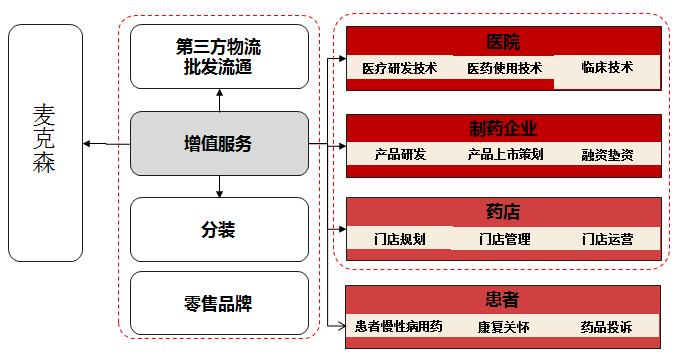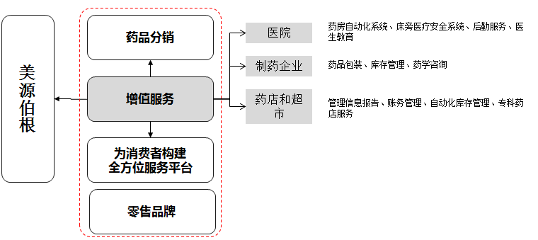 美国的医药商业企业基本被麦克森、康德乐和美源伯根掌控。这三大医药商业企业占据了大约90%的美国医药商业份额。这三个商业企业之所以能够在诸多的医药商业企业竞争中存活,主要是其业态并不单纯是配送、批发,而是向上下游延伸,构建了较为全面的增值服务体系,从而增强了产业链的黏合度和掌控度,强化了自身的服务能力,最终形成了三家对美国医药商业市场的绝对掌控状态。