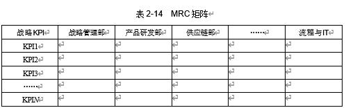 (2) 在 MRC 矩阵中,标记 KPI 对应的各个部门的职责属性(M、R、C);管理部门填写 M,目标达成部门填写 R,填写完 M 和 R 后识别各个协助部门并填写 C;所有的战略 KPI 必须匹配相应的组织,不能有遗漏的情况。