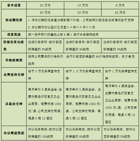 杜康主导产品为酒祖杜康系列,企业经过多方面考虑选取巩义市场(隶属郑州,县级市,全国百强县)作为样板市场进行打造。通过整合经销商资源、营销咨询公司资源、企业资源、团队资源等多方面有利资源进行市场运作,并且企业高层多次亲自深入一线指导。同时,在终端陈列、消费者促销、终端氛围营造、分销商管理等方面进行核心打造。为了快速控制核心名烟名酒店,形成战略联盟,提升本品在其高端酒销售中的比例,抢占名烟名酒店背后的团购和零售资源,特此和终端签署战略联盟协议。首先,对巩义市名烟名酒店进行排查,筛选出有团购背景且配合度高的名烟名酒店。其次,与目标客户逐一沟通,确定合作,并根据其意向分为A类、B类、C类联盟店。战略联盟店划分及政策支持如表3-2所示。