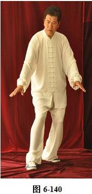 接上式,腰微含,身体重心移至左腿,呈微蹲式。同时两臂翻转下採,眼神下视,接着腰上提,左、右手上翻与右脚同时上提, 右脚向前上步,右脚掌前掌点地,左腿直立,重心仍在左腿上。左手在右肘旁护胸,掌心斜对右肘弯,右手掌心朝上,右手在前,左手在后,两手前后呼应(见图6-139至6-141)。