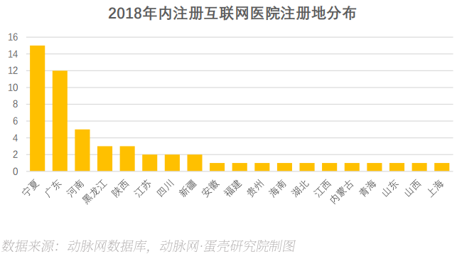《互联网医院管理办法(试行)》明确建立省级互联网医院监管平台是批复互联网医院执业许可的前置条件。大部分省市还未建立起完善的互联网医院监管体系,结合多家互联网医院反馈,目前新设立互联网医院周期有所延长,审核尺度有所趋紧,并且部分地方政府对企业在当地设置互联网医院运营公司注册资本有一定要求,我们统计了167家目前注册名中涉及“互联网医院”企业的注册信息,发现他们的注册资本数集中在1000万元,2018年注册地集中在宁夏回族自治区和广东省,如图2-1、图2-2所示。